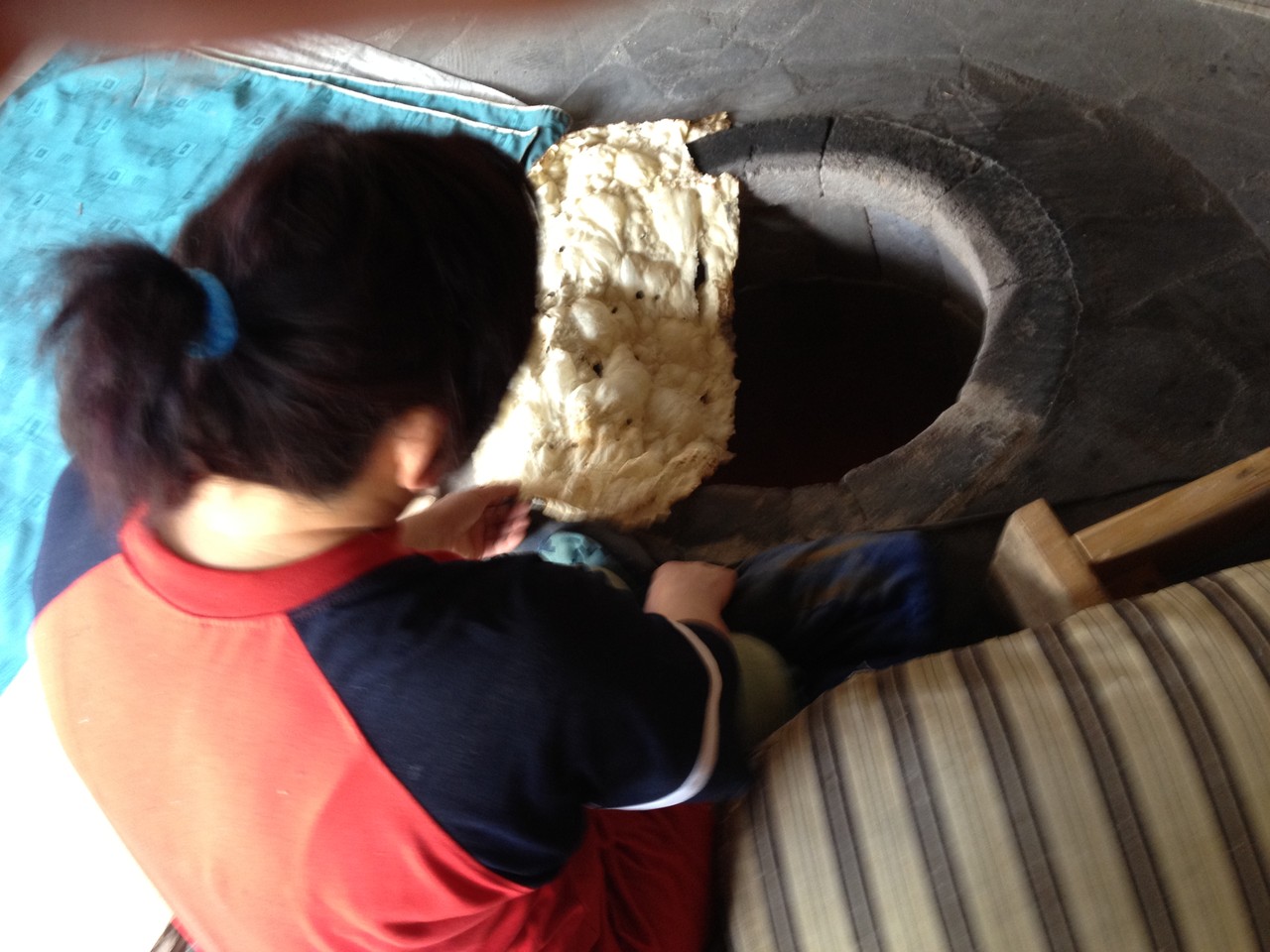 Auf dem Rückweg vom 2. Kloster finden wir ein grünes Plätzchen unterhalb der Strasse, neben einer Kuhherde und einem Bach zum übernachten. Am Bach sind noch Einheimische die Picknicken. Es geht nicht lange, da kommen die Kinder und schauen uns zu. Wir geben einem Vater Gummibärli und Farbstifte zum verteilen. Nach 5 Minunten kommt die Grossmutter, lächelt verlegen, sieht wie ich stricke und schaut sich meine Decke interessiert an. Dann kommen die Kinder, bedanken sich und bringen uns Essen. Da wir bereits gegessen haben, packe ich alles ausser den Kuchen ein. Wir werden morgen ein Festessen haben!