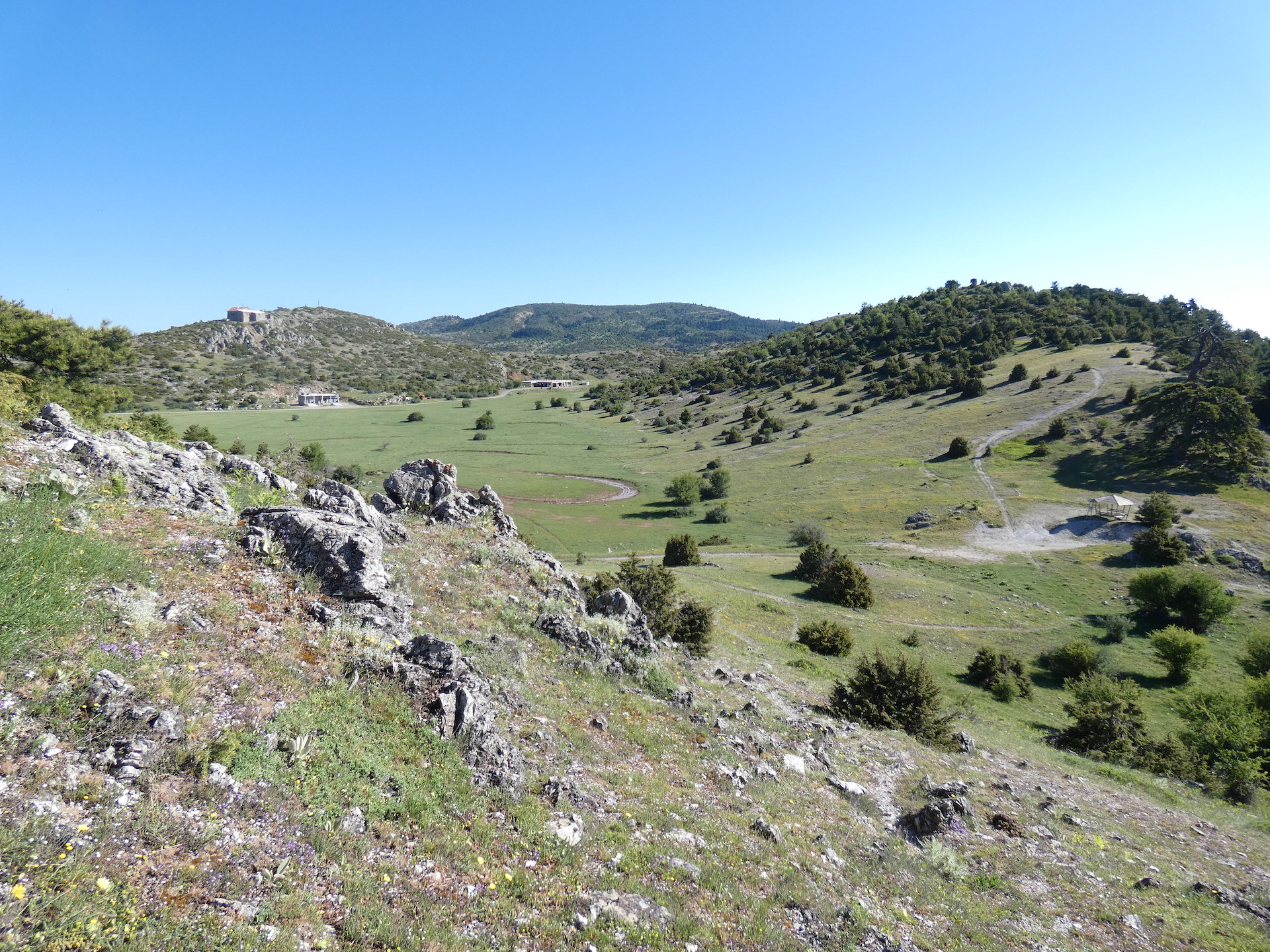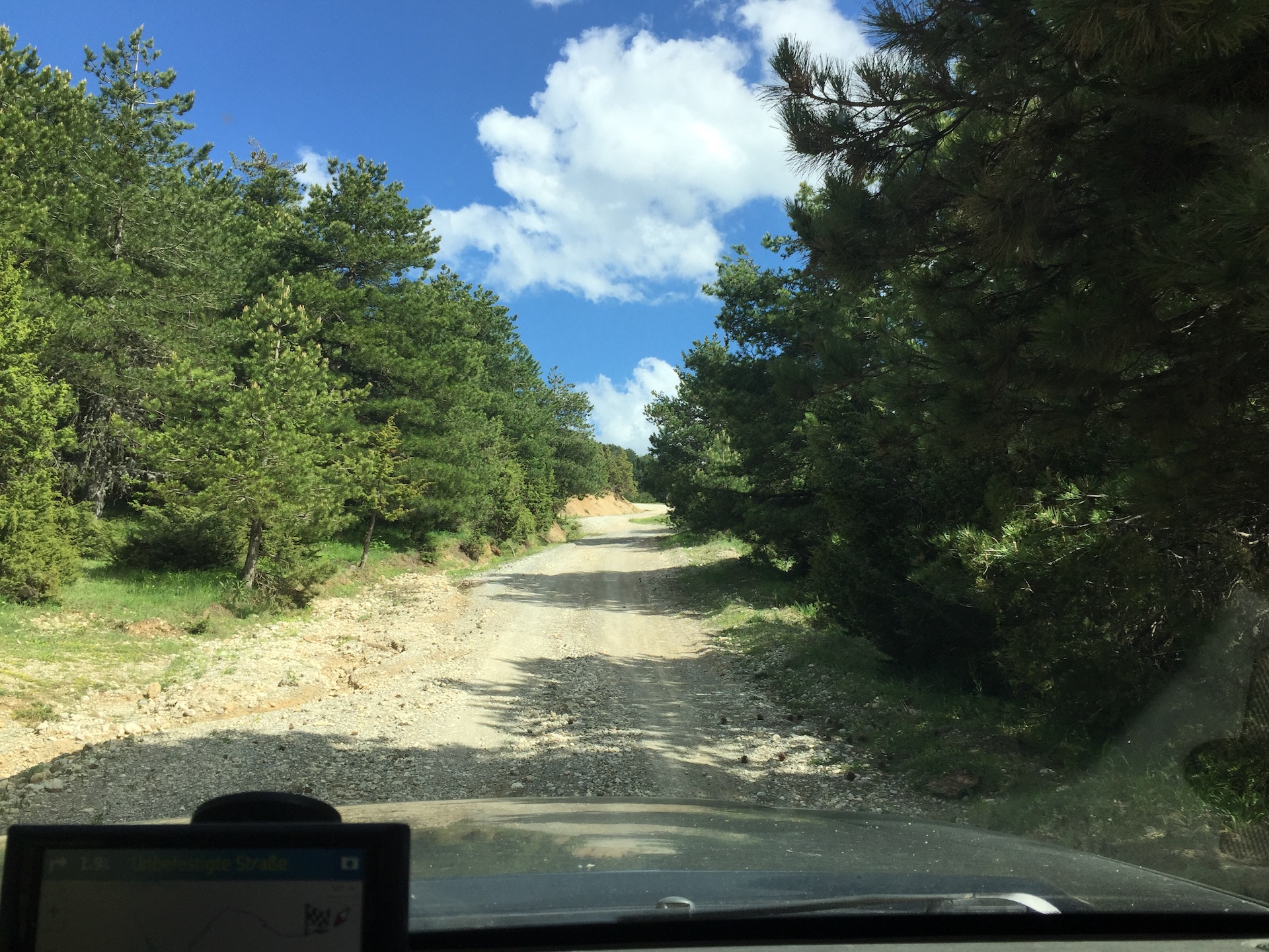 Für heute haben wir genug Sightseeing, wir müssen noch Geld abheben. Eine Schwierigkeit, denn bei den Automaten können wir nicht parken. Schlussendlich klappt es und wir fahren entlang des Meeres bis Xilokastro und dann wieder in die Berge hoch bis zum Ferienort Trikala. Unterwegs müssen wir anhalten, sehen wir doch einen wunderschönen Feuersalamander, der über die Strasse will! Wie ausgestorben ist das an den Hang gebaute Dorf. Unser Navi führt uns durch immer schmaler werdende Strässchen steil bergauf, und das mit Gegenverkehr! Schlussendlich müssen wir aussteigen und abklären, ob der Weg überhaupt weiter geht. Wir nehmen das alte Navi und stellen fest, dass uns das Garmin nicht mehr auf Strassen weiterführt, eher auf kleinen Wanderwegen! Mit dem Rückwärtsgang fahren wir 10 Meter zurück und müssen auf einer Minikreuzung umkehren. Nun geht es mit dem alten Navi weiter und juhui, wir finden den See Limni Dasiou inmitten der traumhaften Bergkulisse. Nur die Piste ist wie in Südamerika übersäht mit Löchern. In der Zwischenzeit hat es wieder Wolken und wir wissen nicht ob es in der Nacht regnet. Der Übernachtungsplatz ist aber feucht, und bei einem allfälligen Regen wären wir hoffnungslos eingesunken auf dieser Wiese. Also geht es weiter, in der Hoffnung einen besseren Platz zu finden, denn es ist schon 17.00 Uhr. Und siehe da, nach einer Piste mit vielen Löchern, aber durch eine traumhafte Landschaft, kommen wir zu der „Grossen Zira“, ein Bergmassiv auf dem immer noch Schnee liegt. Und wir staunen! Vor uns liegt ein grosser geteerter Parkplatz, daneben ein kleiner Skilift (für die Athener!) und ein Berghaus. Auf einem Hügel liegt eine Schutzhütte, und eine zweite soll weiter oben auf der Grossen Zira stehen. Wir sind nicht alleine, Wolfgang, ein Deutscher geniesst die traumhafte Gegend mit uns. Im Sommer werden hier hunderte Ziegen geweidet und deren Milch zu Käse verarbeitet, im Winter wird Ski gefahren.