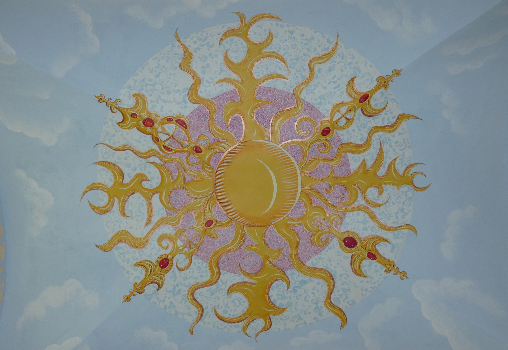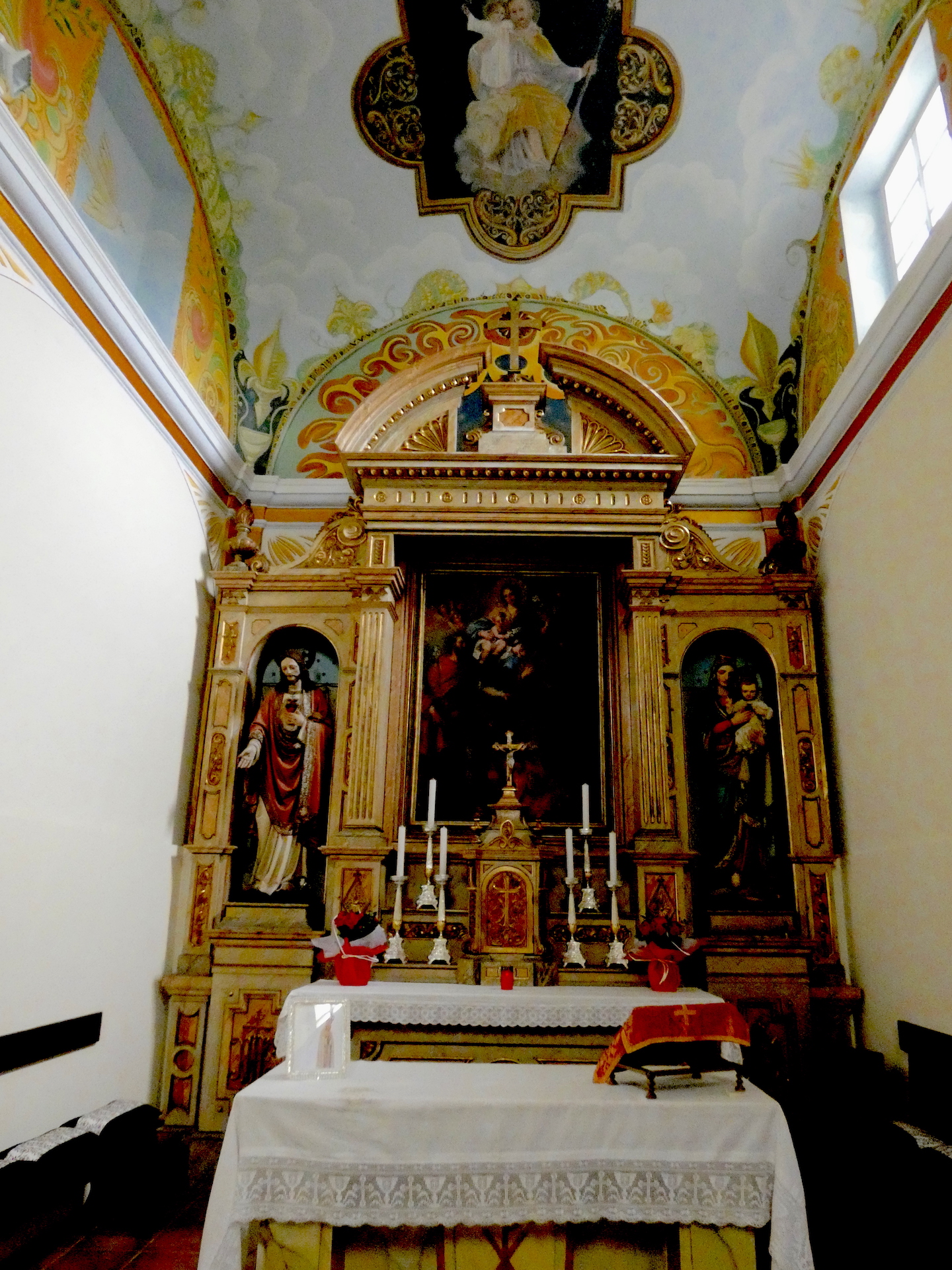 So fahren wir südwärts und biegen in Lugano Nord Richtung Colla ab. Steil und kurvig führt uns die Strasse vorbei an kleinen Dörfern bis Colla. Hier parken wir auf dem Dorfparkplatz und Theres holt uns ab um uns zu ihrem wunderschönen Rustico zu bringen. An diesem traumhaften Ort geniessen Heinz und Theres hier seit 20 Jahren ihre Zeit im Tessin. Leider sieht man nicht in die Ferne, überall hat es Wolken. Am Nachmittag spazieren wir ins Nachbarsdorf um die wunderschön restaurierte Kirche anzuschauen. Ein Schüler von H. J. Geiger hat die Kirche restauriert und dabei alte Bilder stehen lassen und neu etwas gewagte Darstellungen z.B. von Engeln gemalt. Uns gefällt das etwas Extravagante und die alten Bilder sehr.