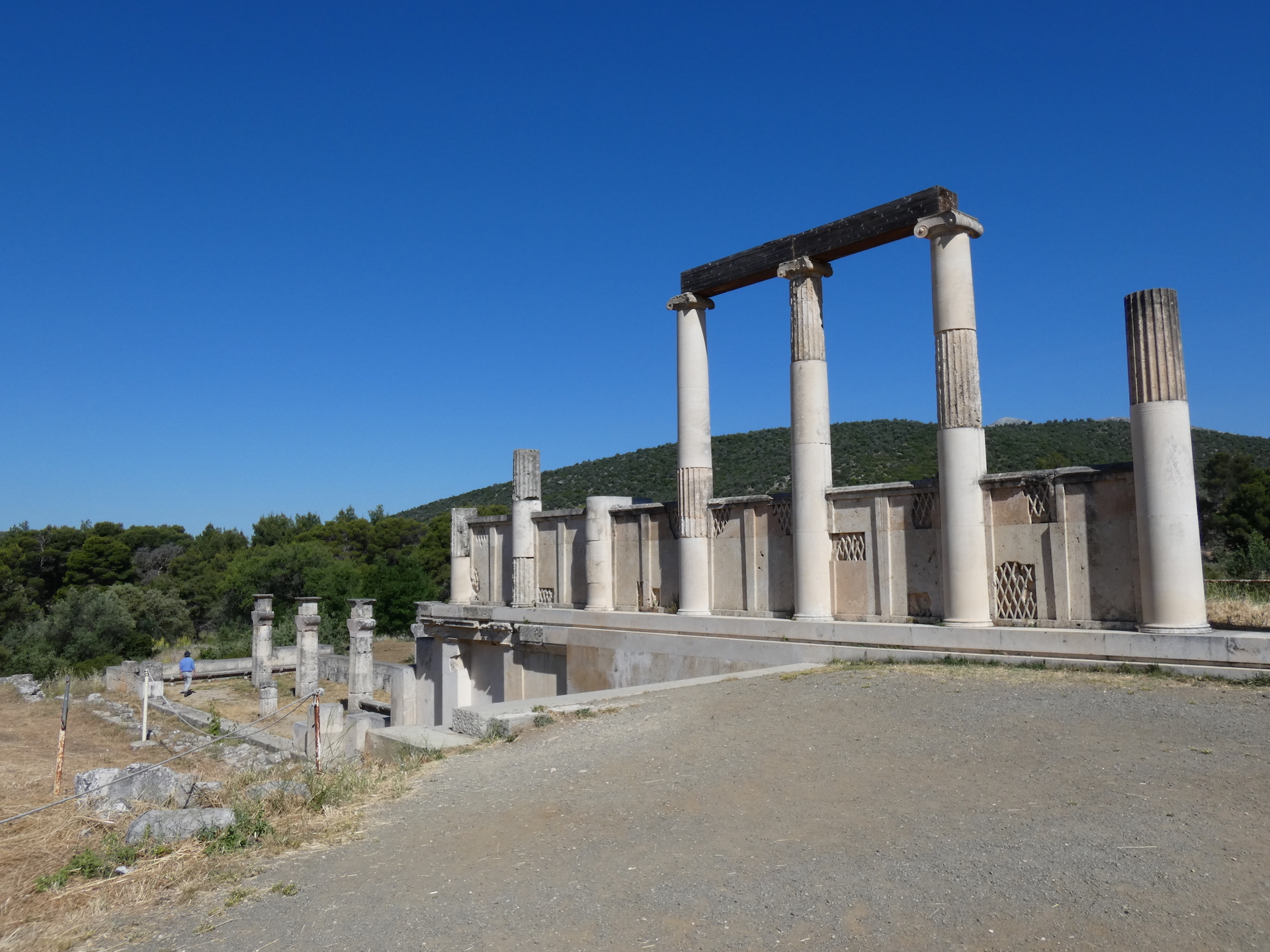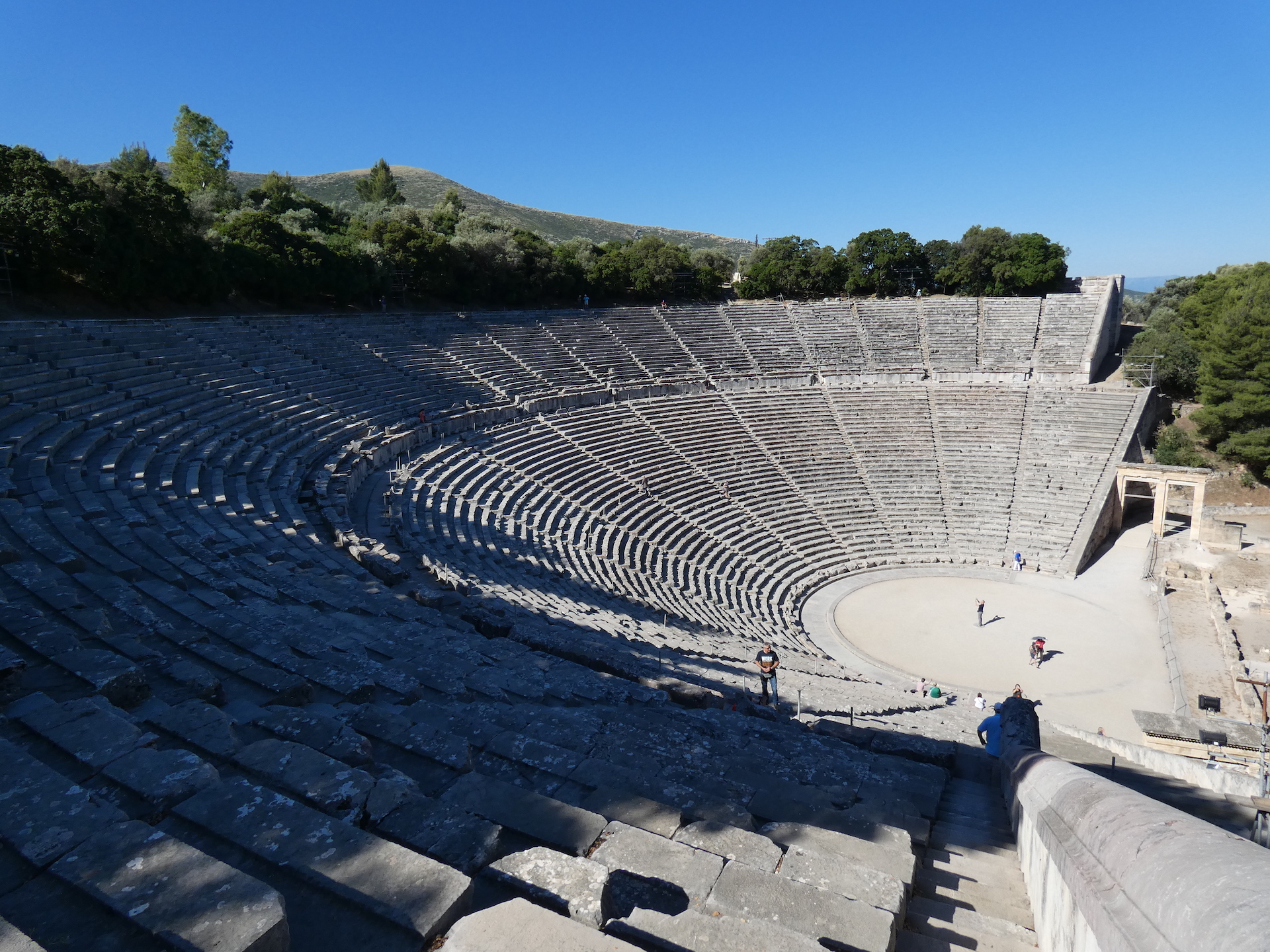 Früh fahren wir los zum Epidauros Theater denn wir wollen bei den Ersten sein. Und wirklich, wir stehen fast alleine im riesigen besterhaltenen Amphitheater aus dem 4.Jh. v. Chr..55 Sitzreihen gibt es und 15000 Zuschauer finden hier Platz. Wir sitzen ganz zuoberst und hören die Münze die ein Reiseleiter mitten in der Arena auf den Boden fallen lässt! Eine unglaubliche Akustik. In der Stadt neben dem Amphitheater lebte der Heilgott Asklepios. Er wird stets mit einem Stab abgebildet um den sich eine Natter windet. Noch heute ist er das Zunftzeichen der Ärzte. Aber selbst Ärzte wissen oft nicht, dass dieses Symbol aus dem alten Ägypten stammt.