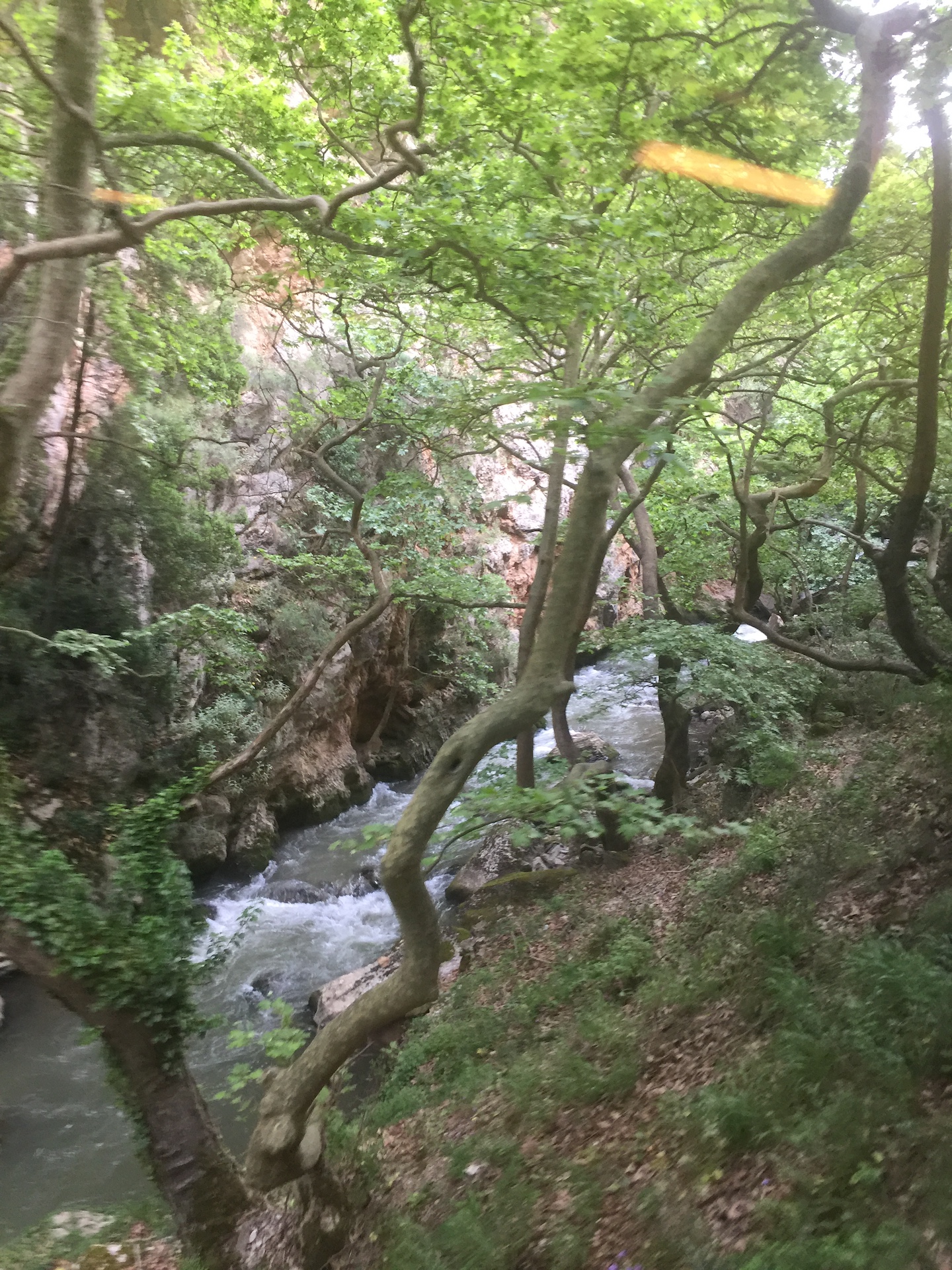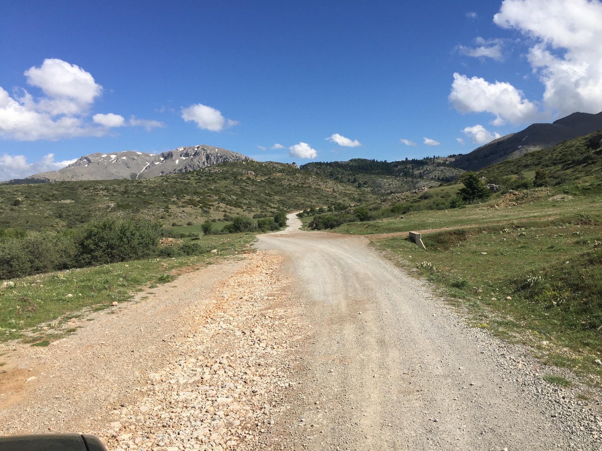 Da es am Morgen regnet, warten wir ab und füllen erst bei den ersten Sonnenstrahlen Wasser auf und entsorgen die Toilette. Wir biegen von der Hauptstrasse ab in die Berge vorbei an vielen blühenden Ginsterbüschen und Wildblumenwiesen. Mit der Übernachtung an einem kleinen See wird dann aber nichts, denn es regnet wieder und in Zarouhla, dem hintersten Dorf im Tal, sind alle Restaurants geschlossen. Dies obwohl hier in den Sommermonaten vermutlich viele Touristen sind. So entschliessen wir uns in Korinth auf einem Parkplatz zu übernachten.
