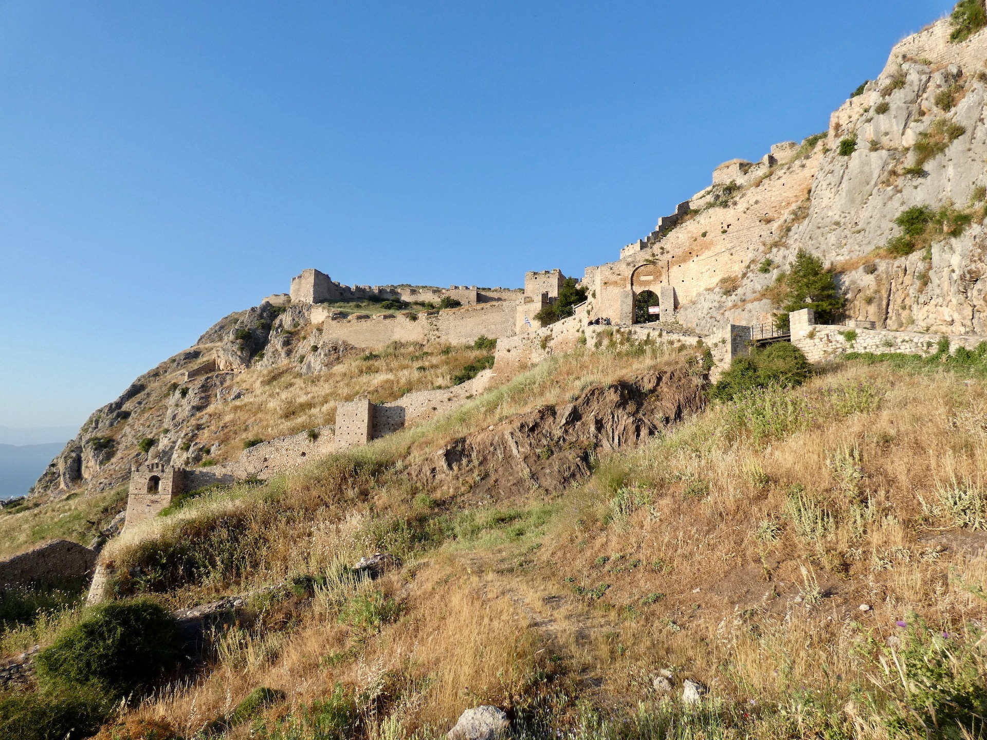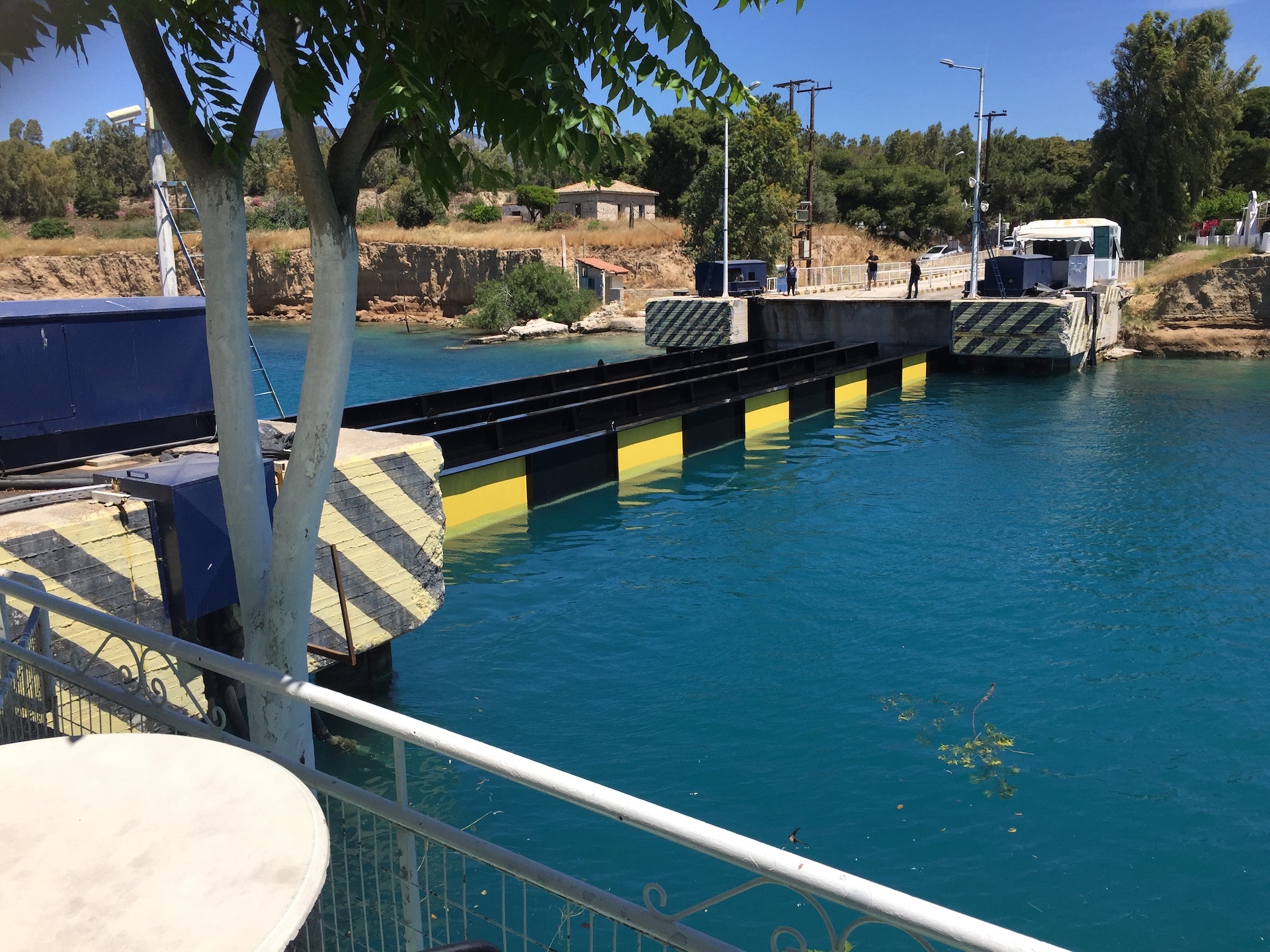Übernachten wollen wir heute hoch über Korinth, bei der alten Burg, mit einer traumhaften Aussicht bis zum Festland von Griechenland. Früh am Morgen, es ist noch angenehme 20 Grad, steigen wir hoch zur riesigen Burg und da bis auf den höchsten Punkt! Gigantisch stehen die Überreste aus verschiedenen Epochen 575m über Korinth. Während dem Abstieg beneiden wir die „aufsteigenden Wanderer“ nicht, es wird heiss, bis zu 30 Grad! Wir duschen und fahren los zum Kanal von Korinth. Dieser wurde 1881 -1893 erbaut und ist 6343 m lang und teilweise 80m hoch. Damals war der Kanal sehr gross mit seiner Weite von 24.6m, heute passen hier die grossen Schiffe nicht mehr hinein. Trotzdem fahren 12500 Schiffe jährlich durch den Kanal und müssen nicht mehr die weite Reise mit 131 nautischen Meilen um Peloponnes machen. Interessant sind die 2 Brücken am Anfang und am Ende des Kanals. Sie werden jeweils 8m tief im Wasser versenkt damit die Schiffe im Einbahnverkehr durchfahren können. Die Autos stehen dann vor einer Schranke und warten, bis sich die Brücke wieder hebt.