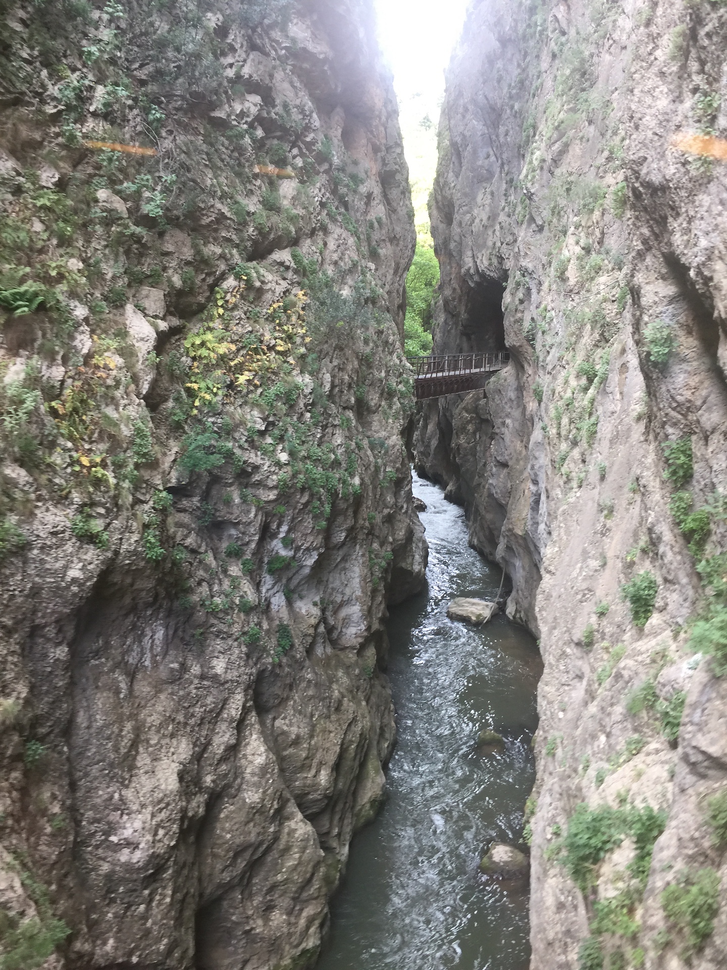Nun brauchen wir einen Tag zum „ankommen“, d.h. waschen, einkaufen, Reiseführer lesen etc. Zum Einkaufen machen wir uns zu Fuss auf den Weg ins Dorf und kaufen dort beim Bahnhof auch gleich noch 2 Tickets für die Zugfahrt von morgen. Mit einem „Stadlerzügli“ mit nur 75cm Spurweite, fahren wir teilweise im Zahnradbetrieb durch die Vouraikos-Schlucht den Berg hoch bis Zahlorou. Wir sind mit der frühen Bahn um 9.05 Uhr unterwegs und sind froh, dass der Zug fast leer ist. Kaum ausgestiegen finden wir uns in vielen Touristenläden, die ihre Ware bereits anbieten. Wir aber spazieren den Berg hoch und müssen noch nachfragen da keine Wegweiser zu einer Gedenkstätte des 2. Weltkrieges zu finden sind. Im Nachhinein müssen wir feststellen, dass wir den Wegweiser einfach übersehen haben. Die griechische Schrift macht uns zu schaffen! Steil geht der Weg über einige Stufen hoch zur Gedenkstätte. Hier haben deutsche Soldaten am 19. Dezember 1943 alle männlichen Bewohner des Dorfes hingemetzelt! Bedrückend und kaum vorstellbar.
